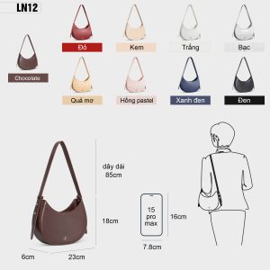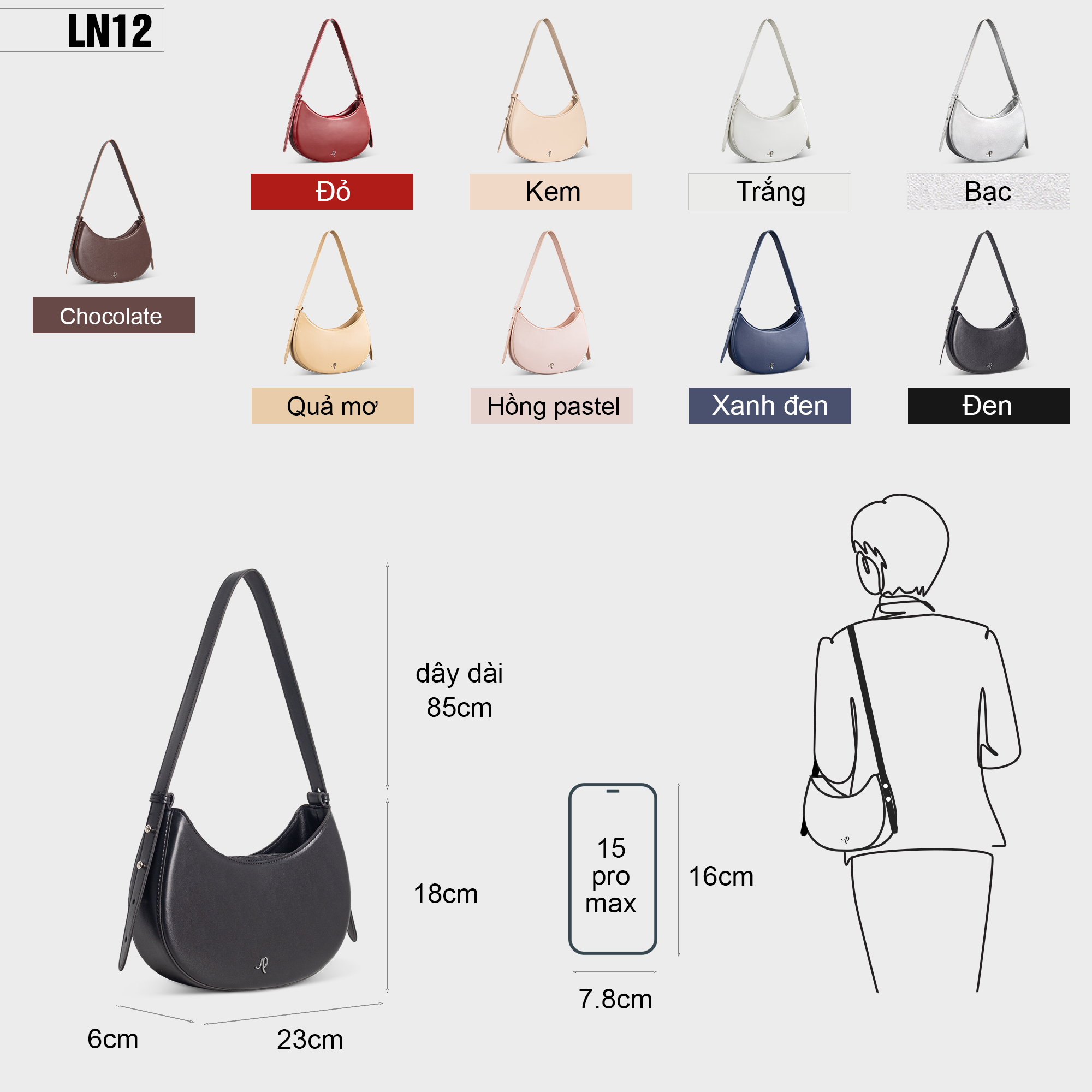 Túi xách nữ đeo vai LN12 từ thương hiệu PETLA mang thiết kế hình bán nguyệt thời thượng, giúp phái đẹp dễ dàng kết hợp với nhiều phong cách khác nhau. Với kích thước nhỏ gọn nhưng vẫn đủ sức chứa các vật dụng cần thiết, LN12 là lựa chọn hoàn hảo cho những cô nàng yêu thích sự tiện lợi và tinh tế.