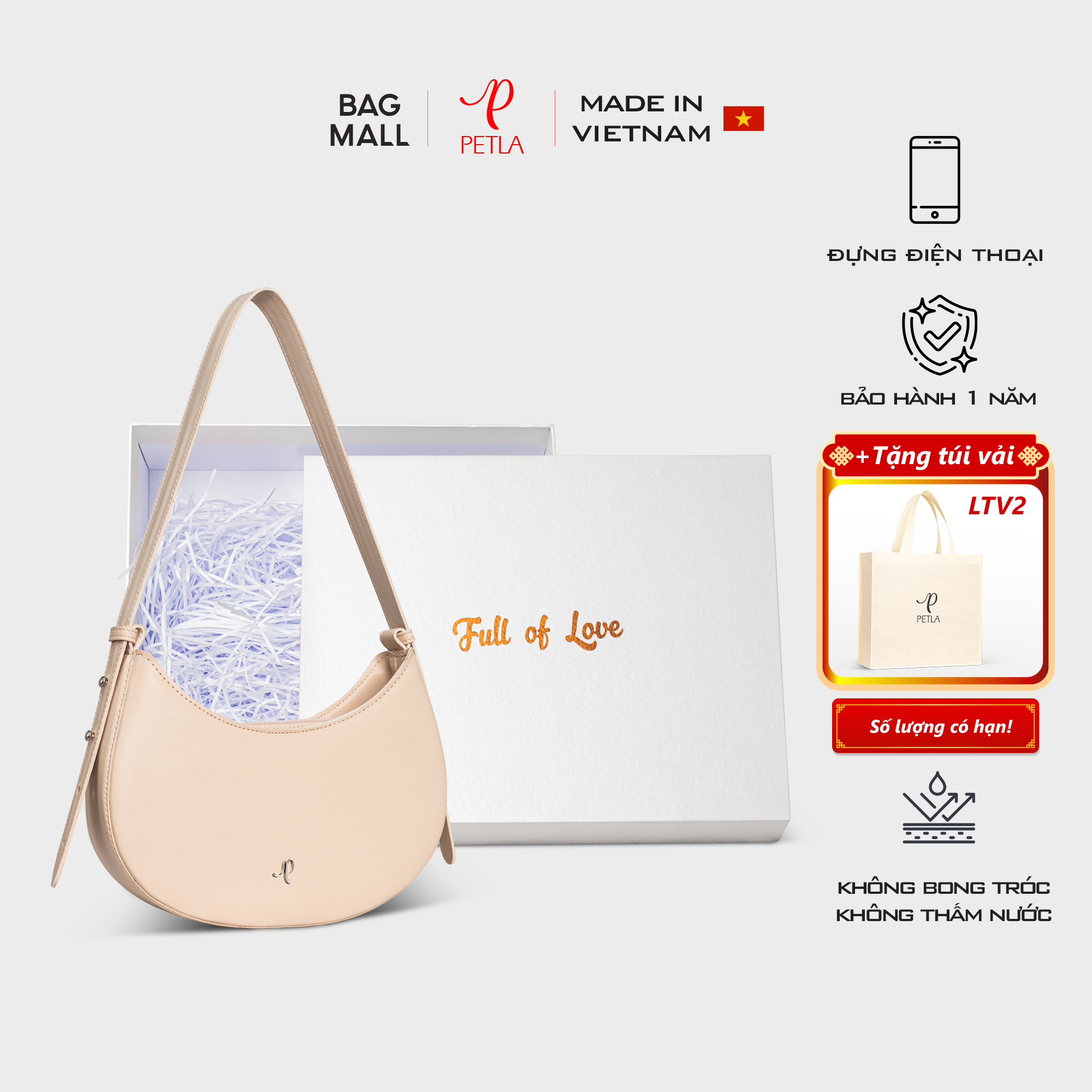 Túi xách nữ đeo vai hình bán nguyệt Petla LN12 màu kem from hộp