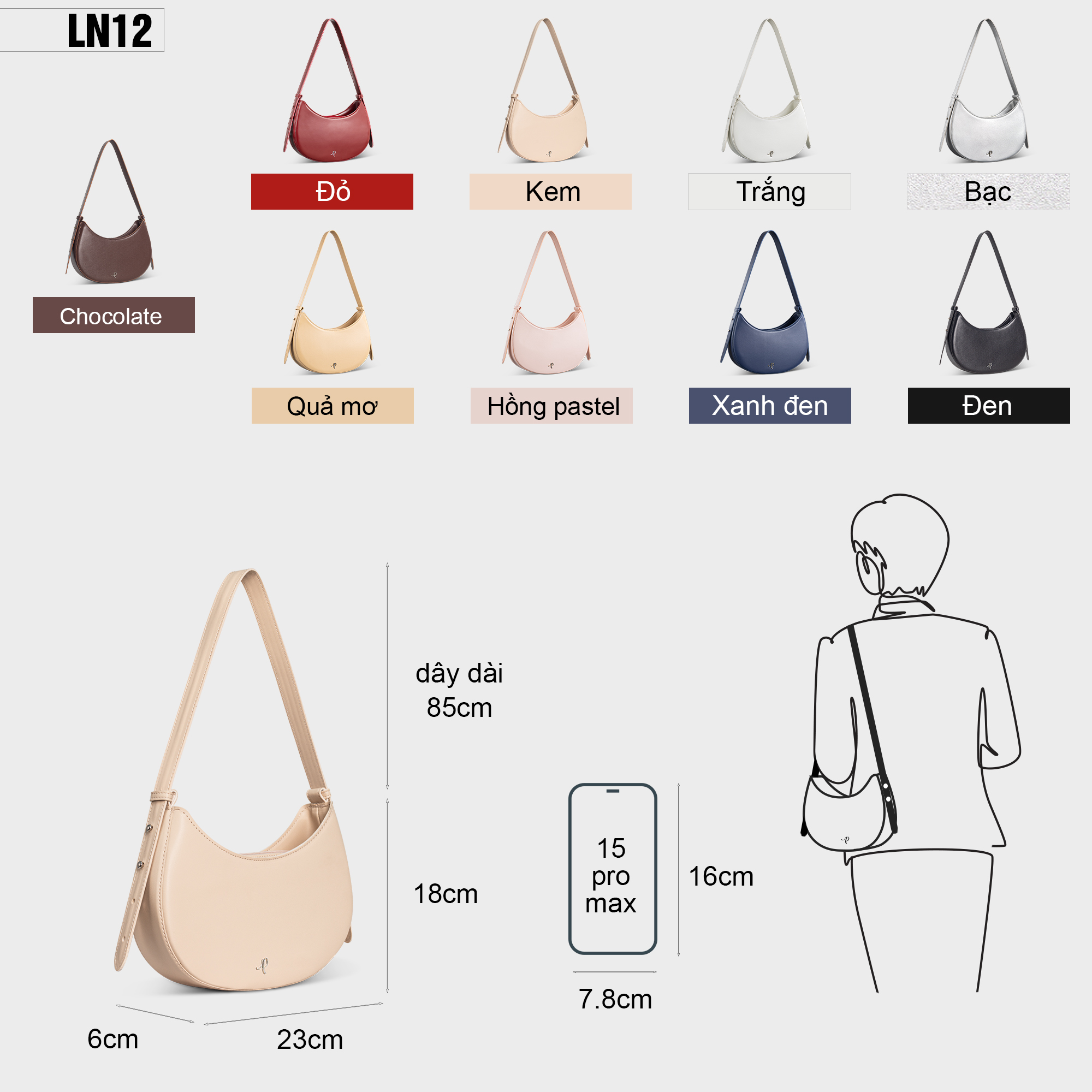 Túi xách nữ đeo vai LN12 từ thương hiệu PETLA mang thiết kế hình bán nguyệt thời thượng, giúp phái đẹp dễ dàng kết hợp với nhiều phong cách khác nhau. Với kích thước nhỏ gọn nhưng vẫn đủ sức chứa các vật dụng cần thiết, LN12 là lựa chọn hoàn hảo cho những cô nàng yêu thích sự tiện lợi và tinh tế.